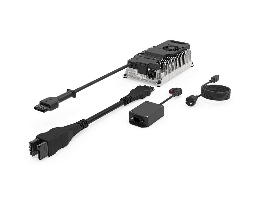 Laden Sie Ihren ZENITH E Zero-Turn in der Hälfte der Zeit auf (nur etwa 5,5 Stunden), verglichen mit der Standardladezeit von 12 Stunden. Im Lieferumfang enthalten sind ein zusätzliches Standard-Ladegerät und ein Y-Stecker. Mit dem Y-Stecker können Sie zwei Ladegeräte gleichzeitig verwenden, um Ihre Ladeleistung zu verdoppeln.