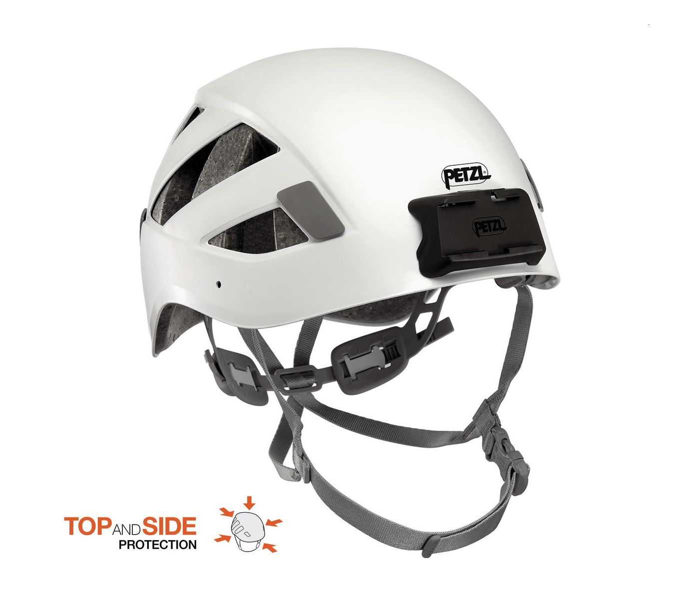 – den Kopf umschließendes Design für erhöhten Aufprallschutz an den Seiten sowie im Vorder- und Hinterkopfbereich (Petzl-Label TOP AND SIDE PROTECTION),