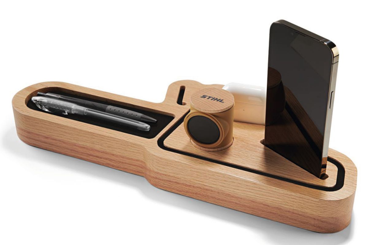 Maximale Praktikabilität. Diese 3-in-1-Ladestation aus hochwertigem Eichenholz ist perfekt für das Büro oder den Schreibtisch zu Hause und bietet Platz für Stifte und Zubehör. Mit ihr können Sie mobile Geräte, Kopfhörer und Smartwatches aufladen. Mehrere Kabel werden direkt mitgeliefert, so dass die Ladestation mit verschiedenen Herstellern (u.a. Apple und Samsung) kompatibel ist. Die Smartwatch wird mit einem eigenen Ladekabel aufgeladen und ist nicht im Lieferumfang enthalten, jedoch sind verschiedene Adapter für die Verwendung unterschiedlicher Ladegeräte enthalten. Mit diesem praktischen Alltagshelfer werden verlorene Ladegeräte und Kabelsalat nur noch eine schlechte Erinnerung sein.