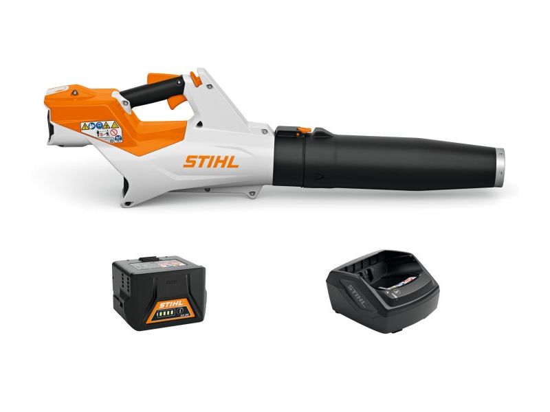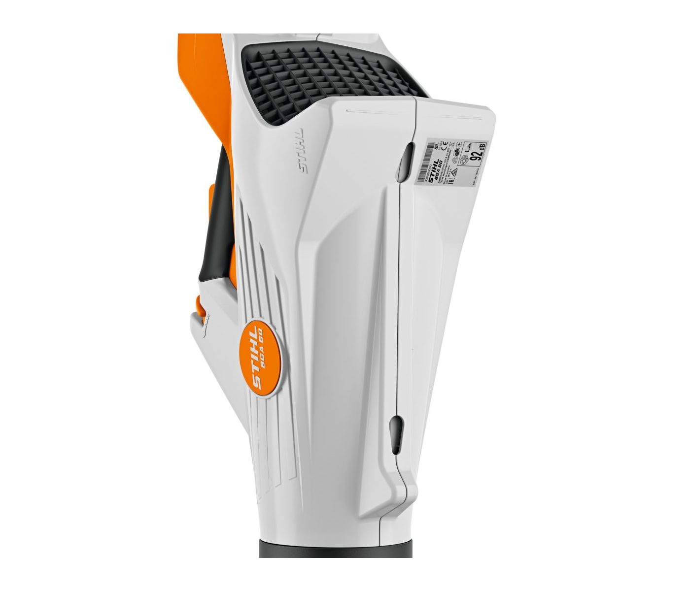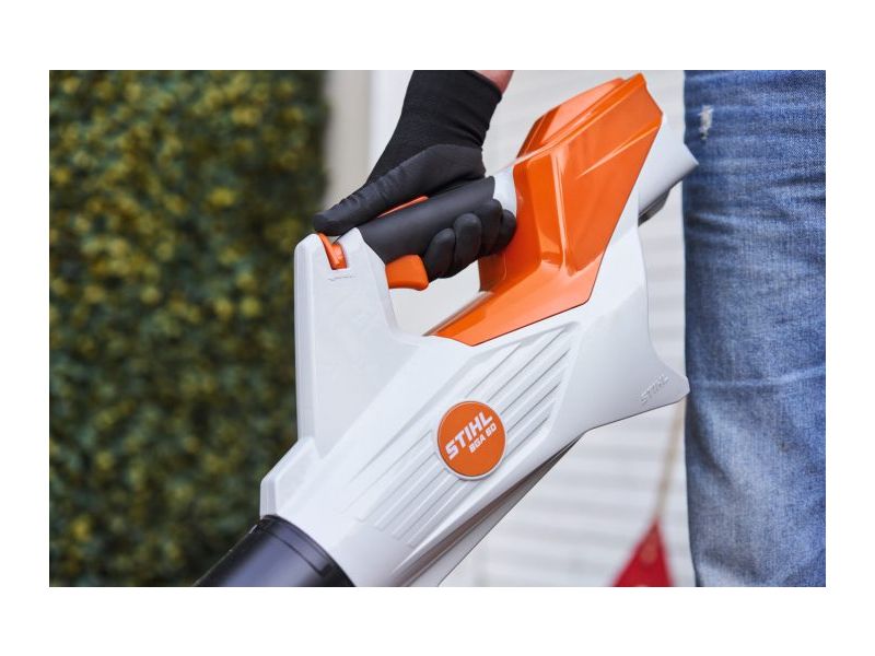 Con il soffiatore a batteria STIHL BGA 60 è possibile utilizzare qualsiasi batteria del sistema STIHL AK. Si consiglia di utilizzare la batteria STIHL AK 30 per il lavoro. Questo soffiatore è dotato di un tubo di soffiaggio regolabile in lunghezza e di un anello metallico sull’ugello rotondo.