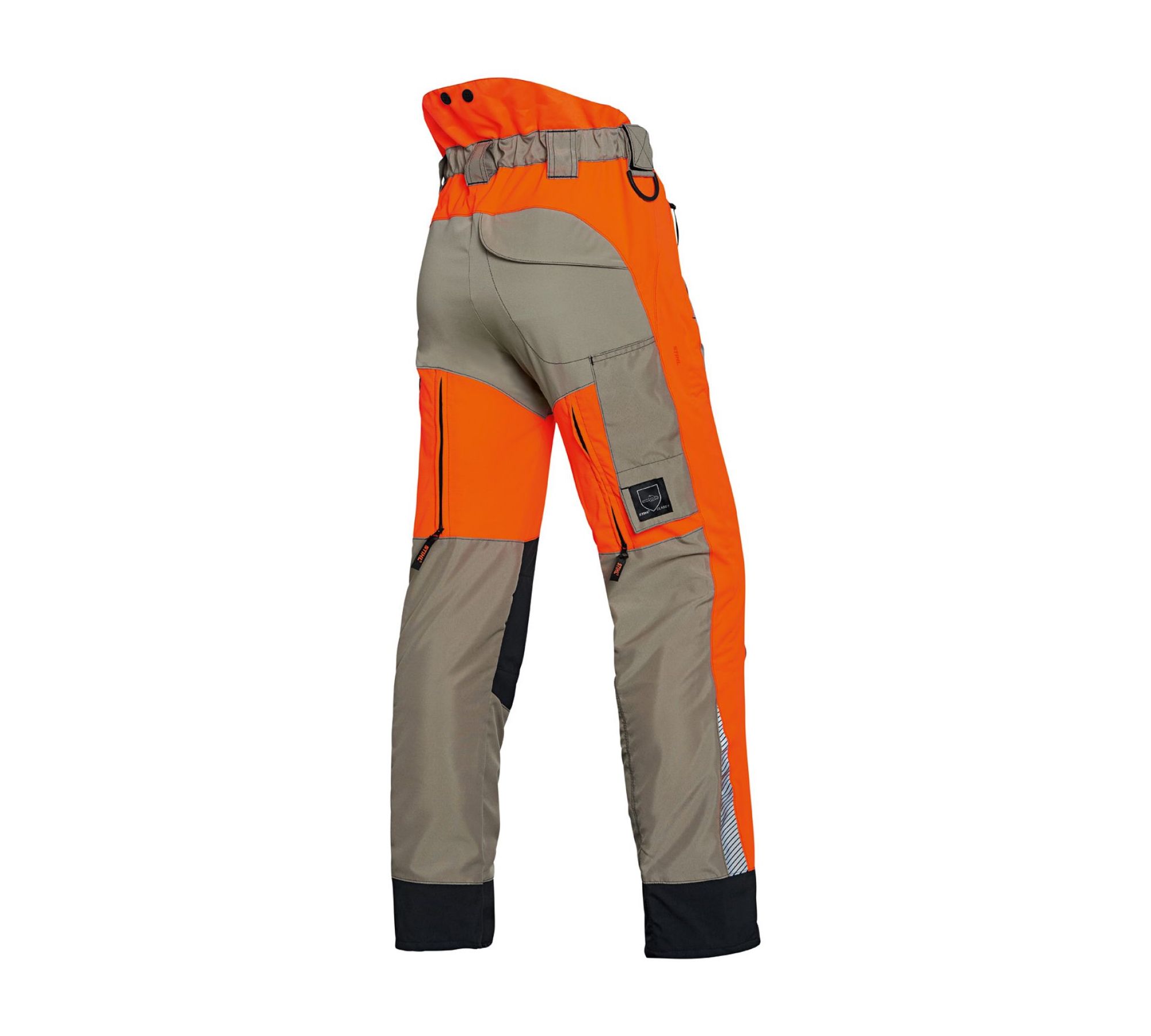 Besonders leichte und atmungsaktive Hose für den Sommer. Farbe orange, schwarz und khaki, Belüftungsöffnungen mit Reißverschluss auf der Rückseite des Oberschenkels, elastischer Rücken, reflektierende Details, verstärkte Knie, zwei Einschubtaschen mit Reißverschluss auf der Vorderseite, Handytasche mit Reißverschluss auf dem Oberschenkel, Schutz vor Dornen und Feuchtigkeit am Unterschenkel.