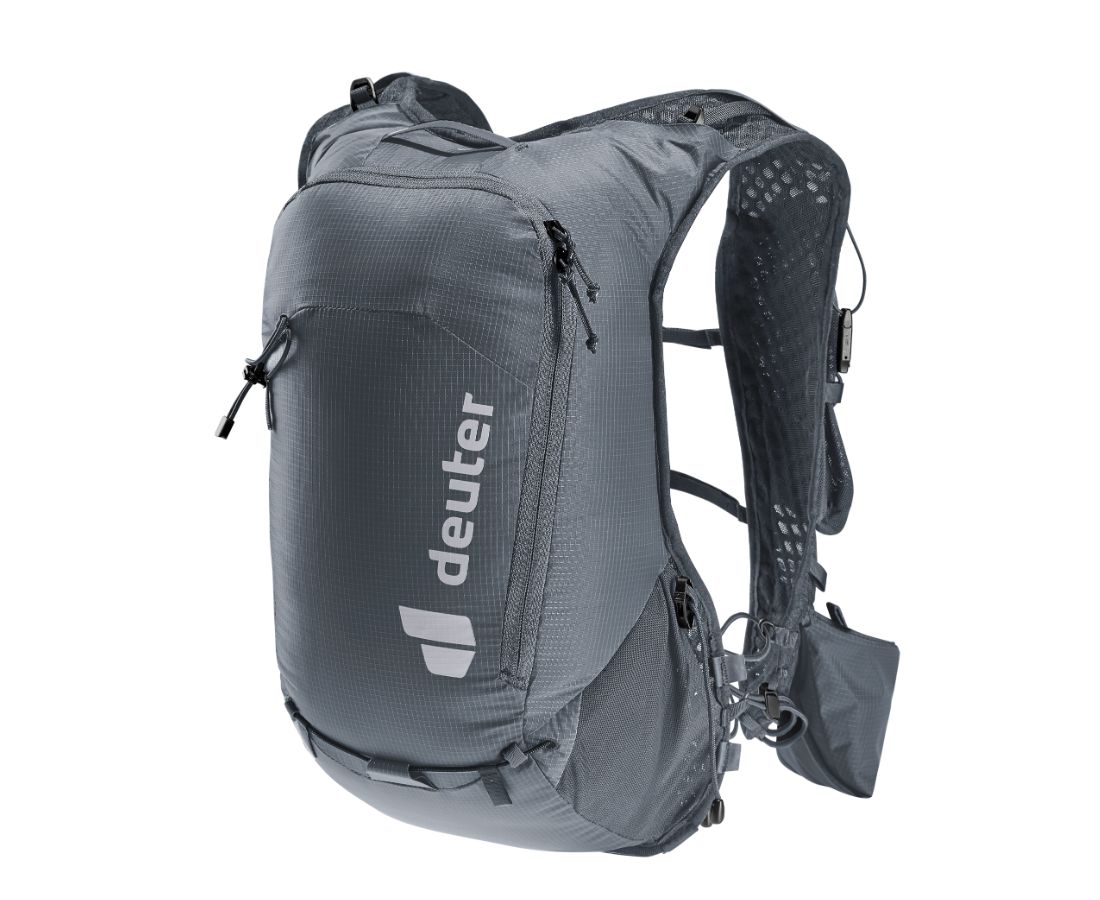 Lightweight and comfortable: ergonomic vest-shaped shoulder straps with elastic compression straps, adjustable chest straps and soft back material allow the backpack to fit the upper body. In addition, the internal mesh pocket and side compression straps minimise the up and down movement of the load while running. The holstered pole holder on the shoulder strap allows quick access to the poles. Soft flask and GPS are also always at hand in the pockets on the shoulder straps. The main material of the Trailrunnig backpack is 100% recycled and bluesign® certified.