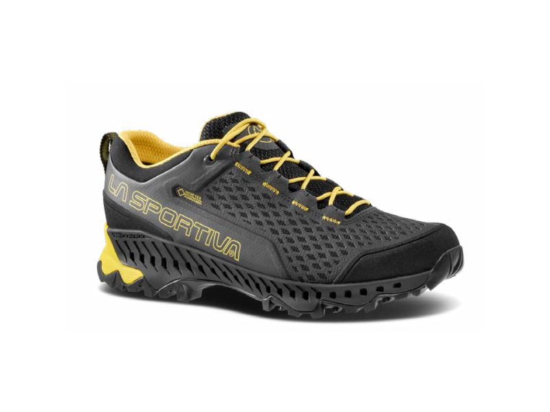 Spire is the new generation of fast hiking footwear. It adopts solutions that are part of La Sportiva’s mountain DNA, combining them with technologies and concepts derived from Mountain Running for a versatile, waterproof and super-breathable product thanks to the new GORE-TEX SURROUND® technology: an exclusive technology that allows total breathability thanks to the greater ventilation surface area that includes the upper, insole and midsole in EVA and TPU perforated on the sides. The ventilation channels visible along the profile of the midsole are protected by a very resistant mono-bava nylon mesh to prevent the entry of pebbles and impurities. The low-cut upper is made with a Nano-Cells 2.0™ structure composed of super-breathable cells that work in synergy with the GORE-TEX SURROUND® membrane for unprecedented increased breathability. The lower part of the shoe sees the integration of the Stability control System™, an anti-torsional stabilisation system that integrates the ventilation holes of the GORE-TEX SURROUND® technology. The tread is in Vibram XS Trek compound for excellent grip on hard, soft and muddy terrain. All-round breathability and comfort.