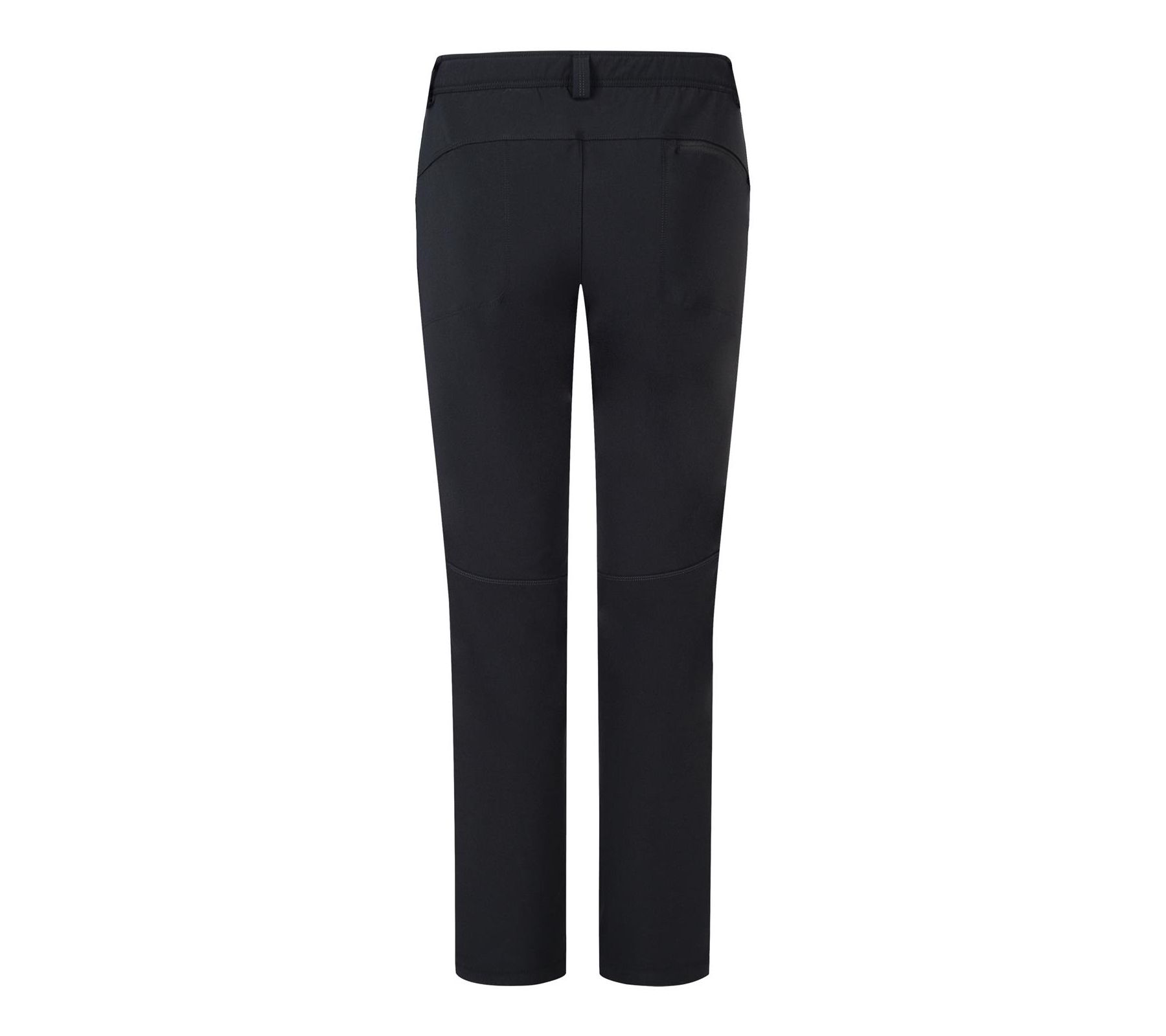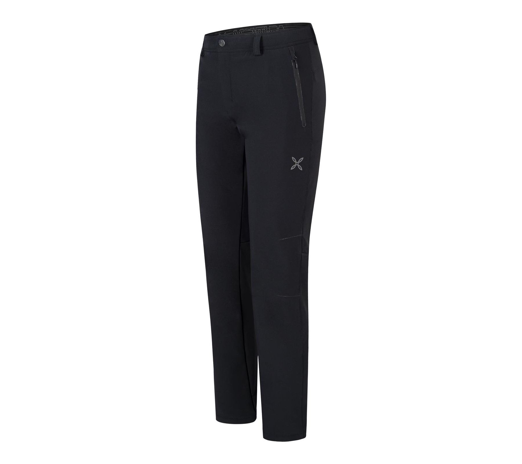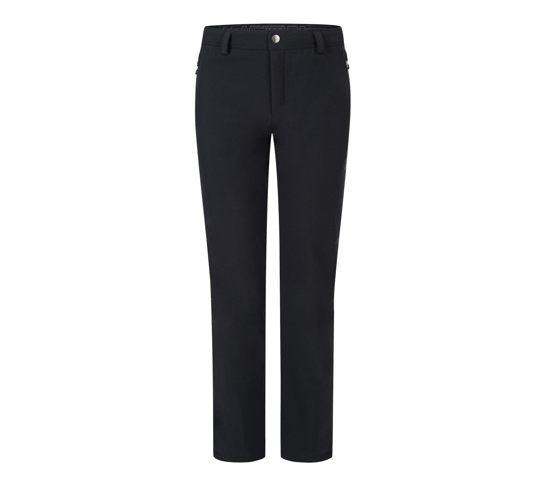 • Stretch waistband with belt loops, button and zip