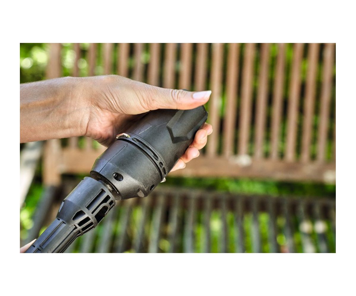 Particularly comfortable and lightweight high-pressure washer with PIU to comfort. CONTROL function with push-button pressure adjustment and LED pressure indicator directly on the gun, hose reel for easy handling and high-pressure hose storage. Nozzle – in 1 with integrated rotor nozzle, flat jet nozzle and detergent nozzle. Safe and space-saving storage of accessories directly on the high pressure washer.