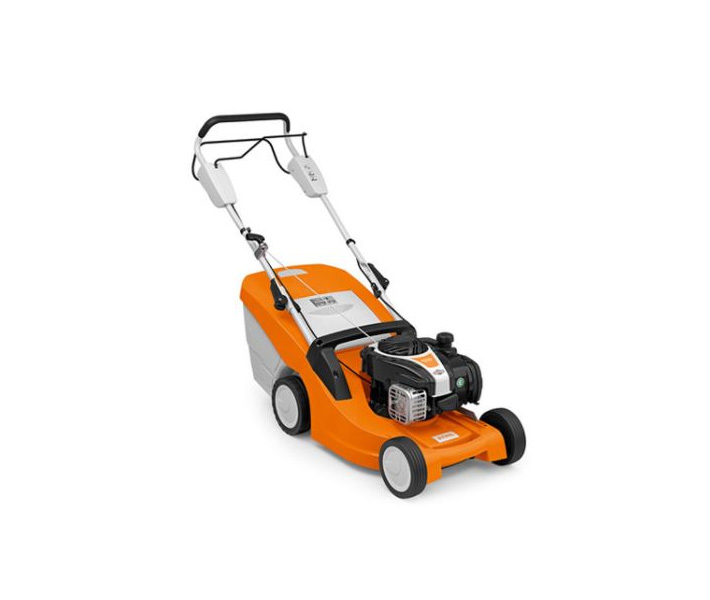 Compact petrol mower with a cutting width of 41 cm for medium-sized areas. Central cutting height adjustment, ergonomic rubber handle, QuickFix quick-release clamps, easy-to-manoeuvre wheels and 1-speed wheel drive for greater operating comfort. Foldable 55 litre grass catcher with fill level indicator included.
