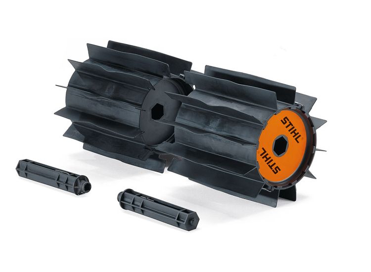 The brush roller (KW) for mounting on the Multi Motor MM 55 with its soft but robust rubber blades ensures perfect cleaning of terraces, paths and walkways on green surfaces. The roller rotates against the direction of travel and thus radically and quickly frees surfaces from dirt, sand and gravel. The brush roller is also excellent for sweeping snow or removing foliage from grassy surfaces.