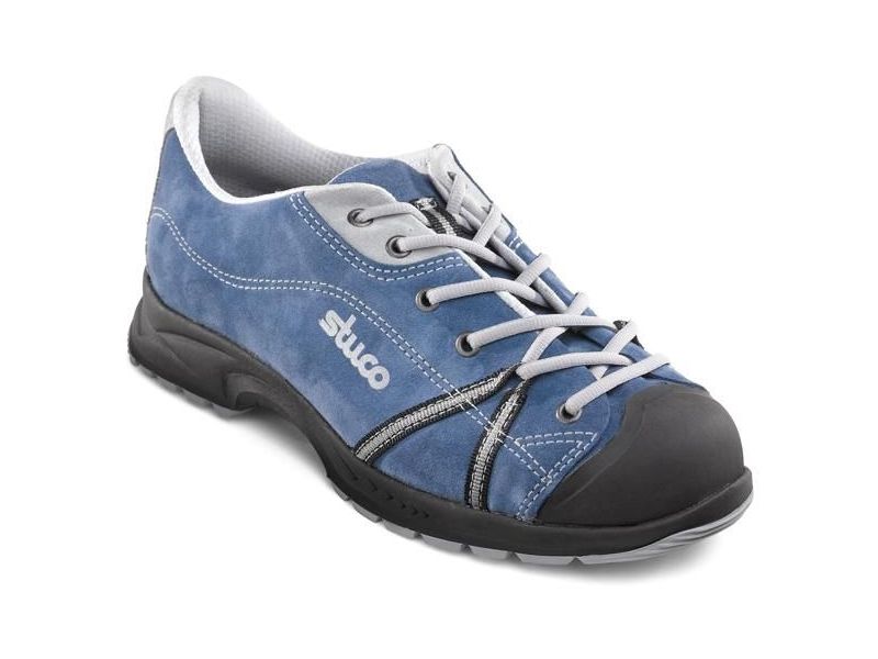 Quality shoes according to EN ISO 20345 S3 SRC ESD standard, sporty and lightweight safety shoe, blue suede cowhide leather upper, breathable fabric lining, Enigma zero HT2 insole, puncture resistant, Jo-Motion footbed insert with microfiber lining, soft padding on collar and tongue, ergonomic steel toe cap, anti-static, ESD.