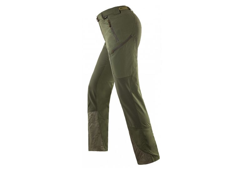 Lightweight technical summer or early season trousers. Knee and breeches, the most exposed parts, are made of bi-elastic, water-repellent SCHOELLER® DRYSKIN with an anti-snagging (thread pull) treatment to give fit and strength. The base fabric is made of TACTEL, a tough, cotton-like polyamide, very soft and light with wicking- moisture treatment to quickly absorb perspiration and disperse it over a larger surface area where it can quickly evaporate. Kevlar® internal ankle reinforcement. Waistband with elastic gathers and internal strap with adjustment buckle. Overall a pleasant feeling of freshness, lightness, fit and protection.