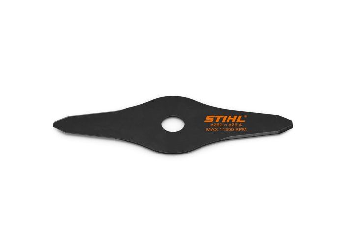 Lame de coupe d’herbe en acier avec deux arêtes de coupe. Réversible. Application principale : fauchage d’herbe forte et sèche, de mauvaises herbes fortes, de roseaux ou d’orties. À utiliser uniquement avec la protection universelle.