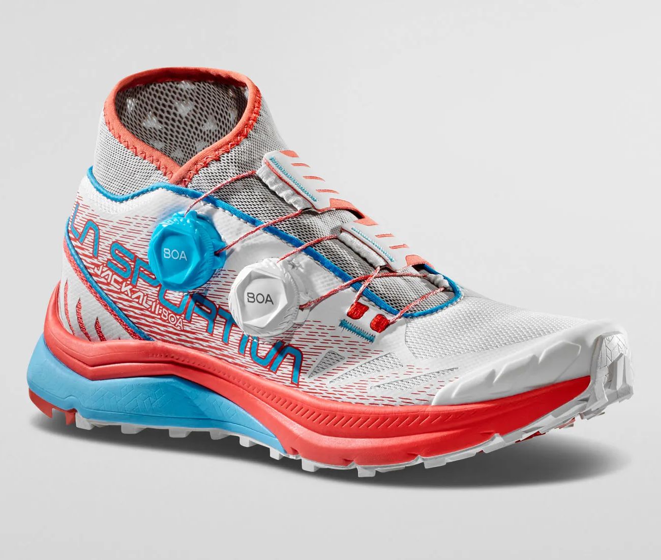La Sportiva Jackal II BOA est une chaussure de course en montagne très performante pour les très longues distances. Elle est dotée du système PerformFit™ Wrap et BOA® Fit System, testé et éprouvé scientifiquement, pour un ajustement de précision rapide et sans effort. Deux rouleaux BOA® sur la tige protectrice, associés à une languette à double verrouillage en microfibre 3 couches, assurent un ajustement parfait sur chaque zone du pied pour un maintien maximal du talon. Cela augmente la stabilité et réduit l’impact du contact sur les parties les plus techniques d’un parcours d’ultra-marathon.