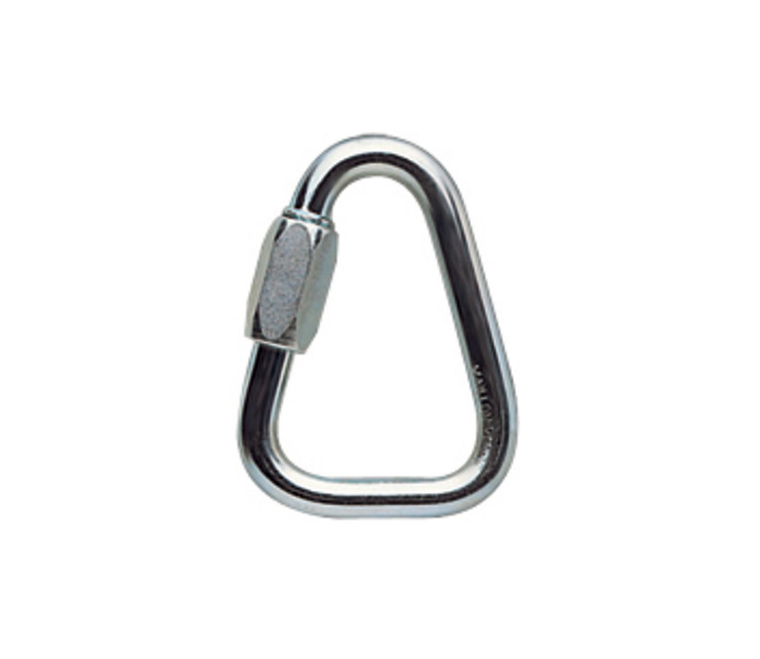Maillon rapide en acier, de forme triangulaire.