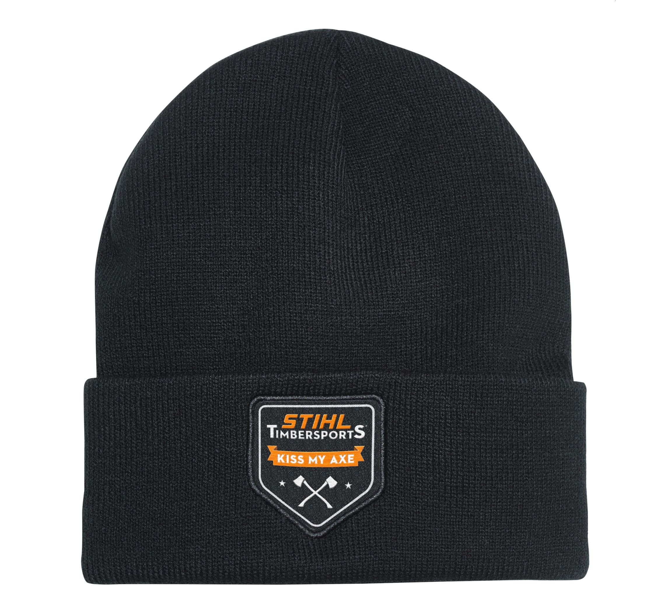 Noir, 100 % acrylique, badge tissé « KISS MY AXE ». Taille unique.