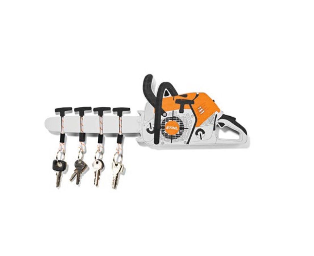 Ne cherchez plus jamais vos clés ! Avec ce panneau de clés STIHL en forme de tronçonneuse, toutes vos clés seront faciles à trouver à l’avenir. Le panneau de touches est en bois et s’inspire de la MS 500i. Un aimant intégré dans le corps permet d’y placer des clés et d’autres objets métalliques légers sans qu’ils ne tombent. Le panneau de clés comprend également quatre anneaux qui ressemblent à la poignée d’une tronçonneuse en métal.