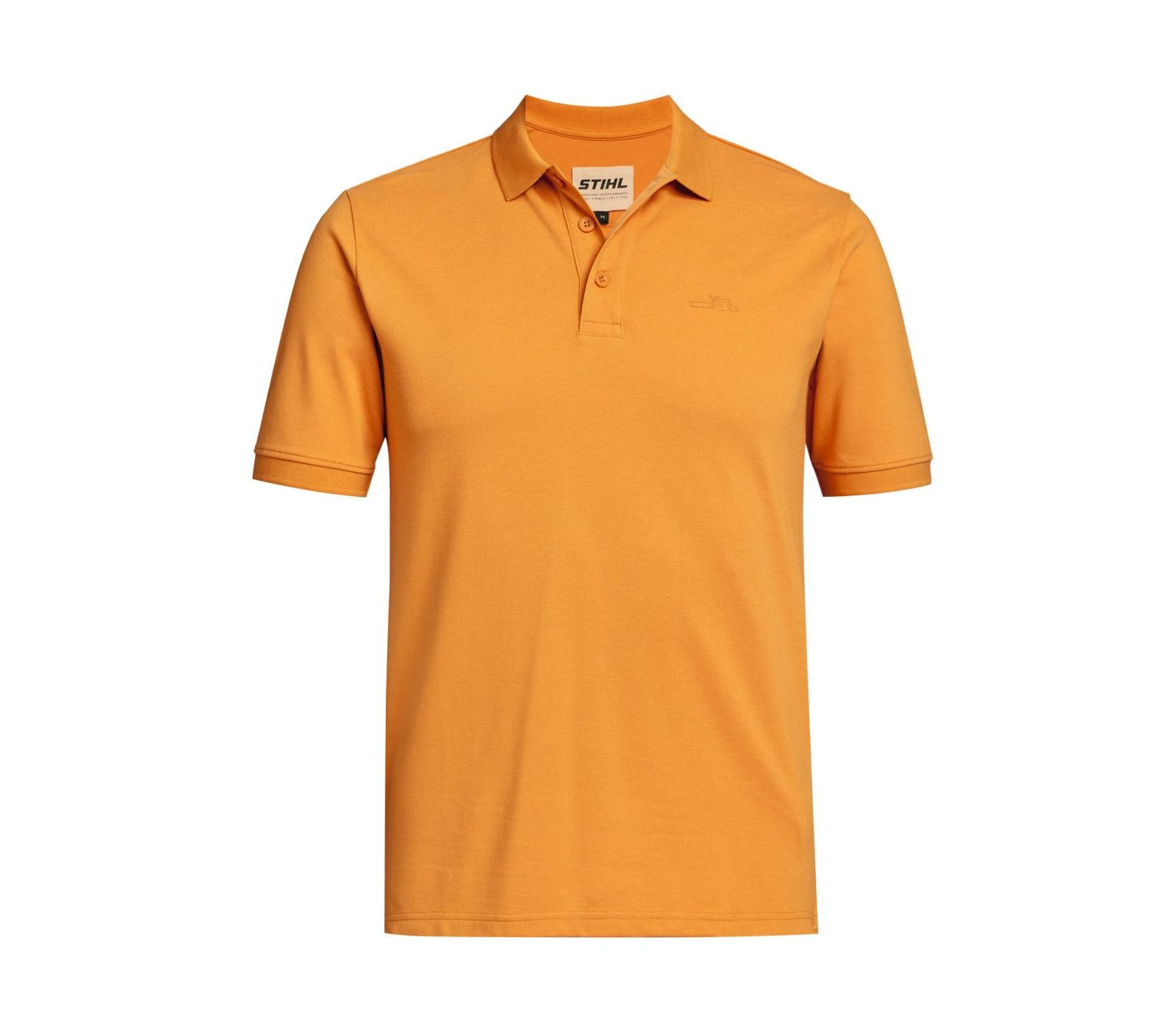 Polo pour hommes en 60 % coton et 40 % polyester. Le col est étroit et sportif et se termine à l’avant par une patte de boutonnage à trois boutons. L’icône de la tronçonneuse STIHL est imprimée en 3D, légèrement en relief. Dans le dos, une petite étiquette tissée « LEGENDARY PERFORMANCE » est apposée en bas à droite.