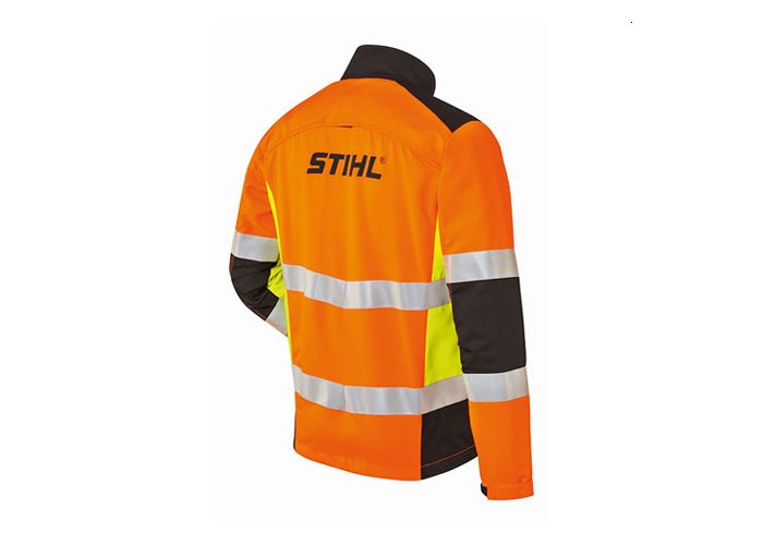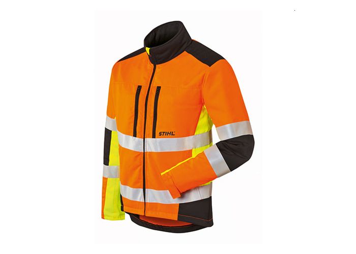 Veste de signalisation légère et thermoactive qui offre une bonne liberté de mouvement. Coloris orange et jaune de signalisation ainsi que noir, matière extérieure et doublure : 100 % polyester. Protection contre les épines au niveau des coudes et des épaules. Matière de ventilation au niveau des bras. Deux poches de poitrine avec fermetures Éclair, orifice de sortie pour harnais au niveau du dos, signalisation EN 20471 classe 2, avec renforts anti-coupures sur la poitrine, les épaules, les bras et le ventre, EN 381, classe 1 (= 20 m/s), design A. En cours de test validant l’utilisation par le KWF.