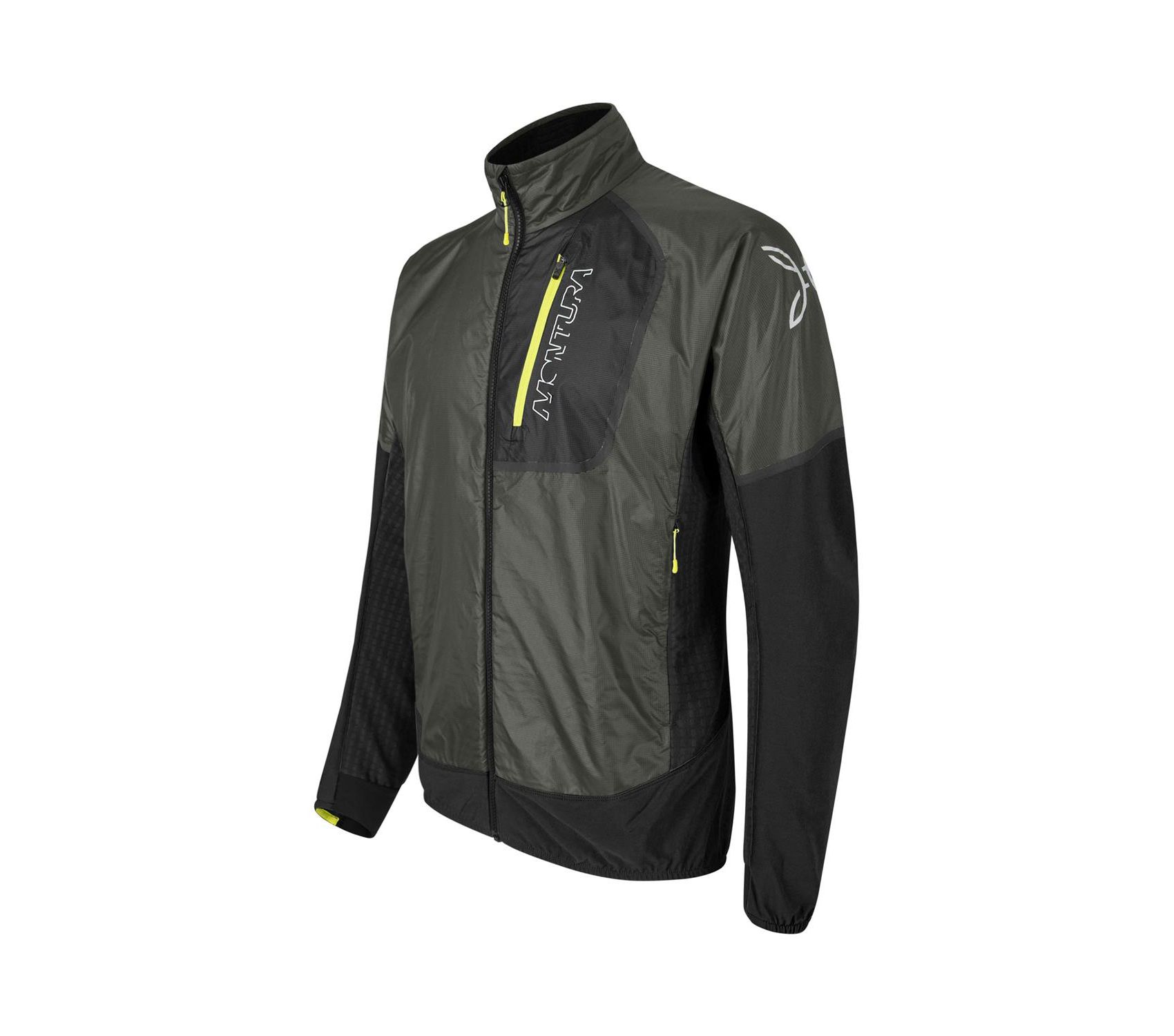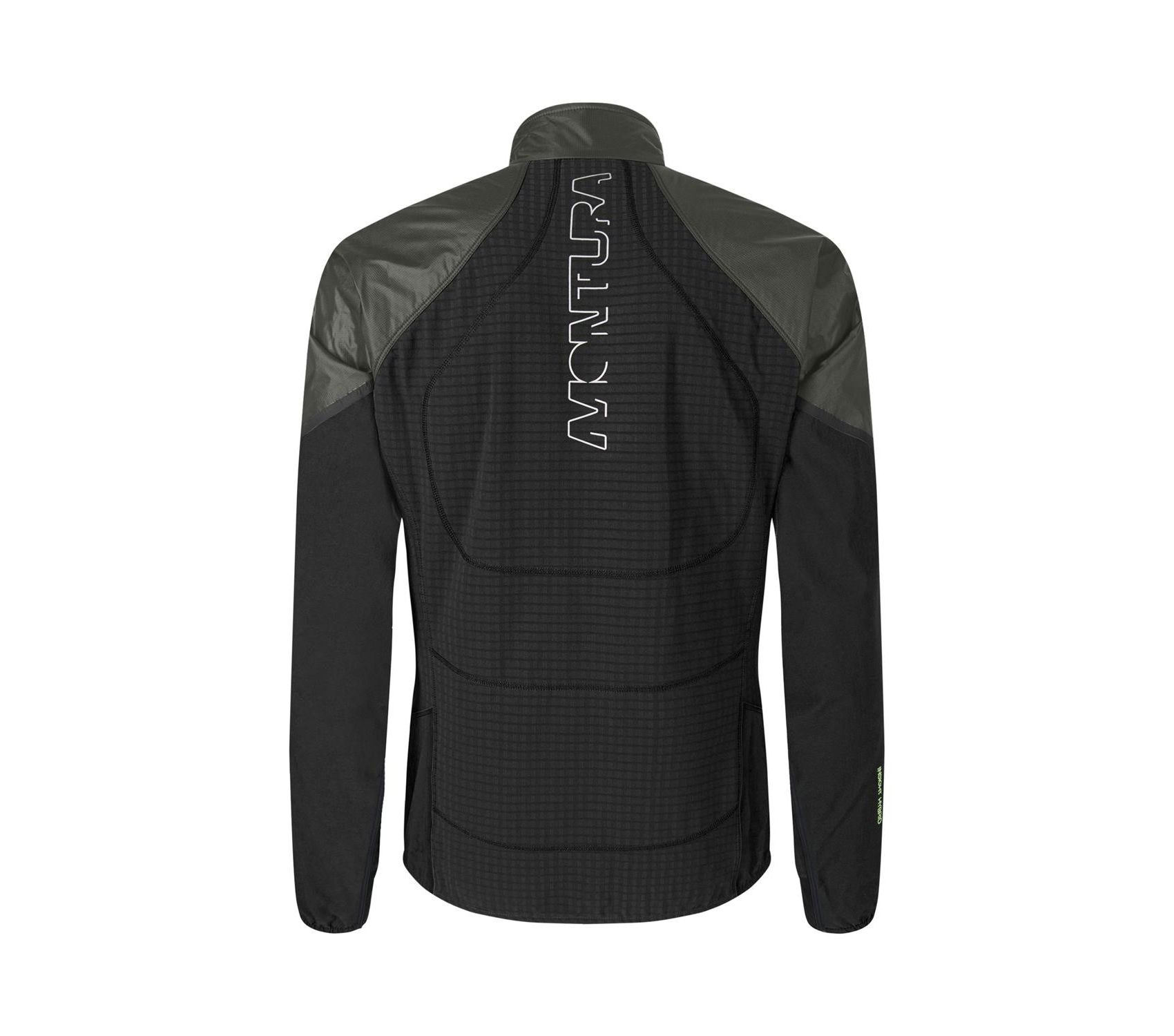 – Dettaglio a contrasto in tessuto di poliestere elasticizzato con costruzione ibrida a doppia trama e ad alto soffio e trattamento DWR