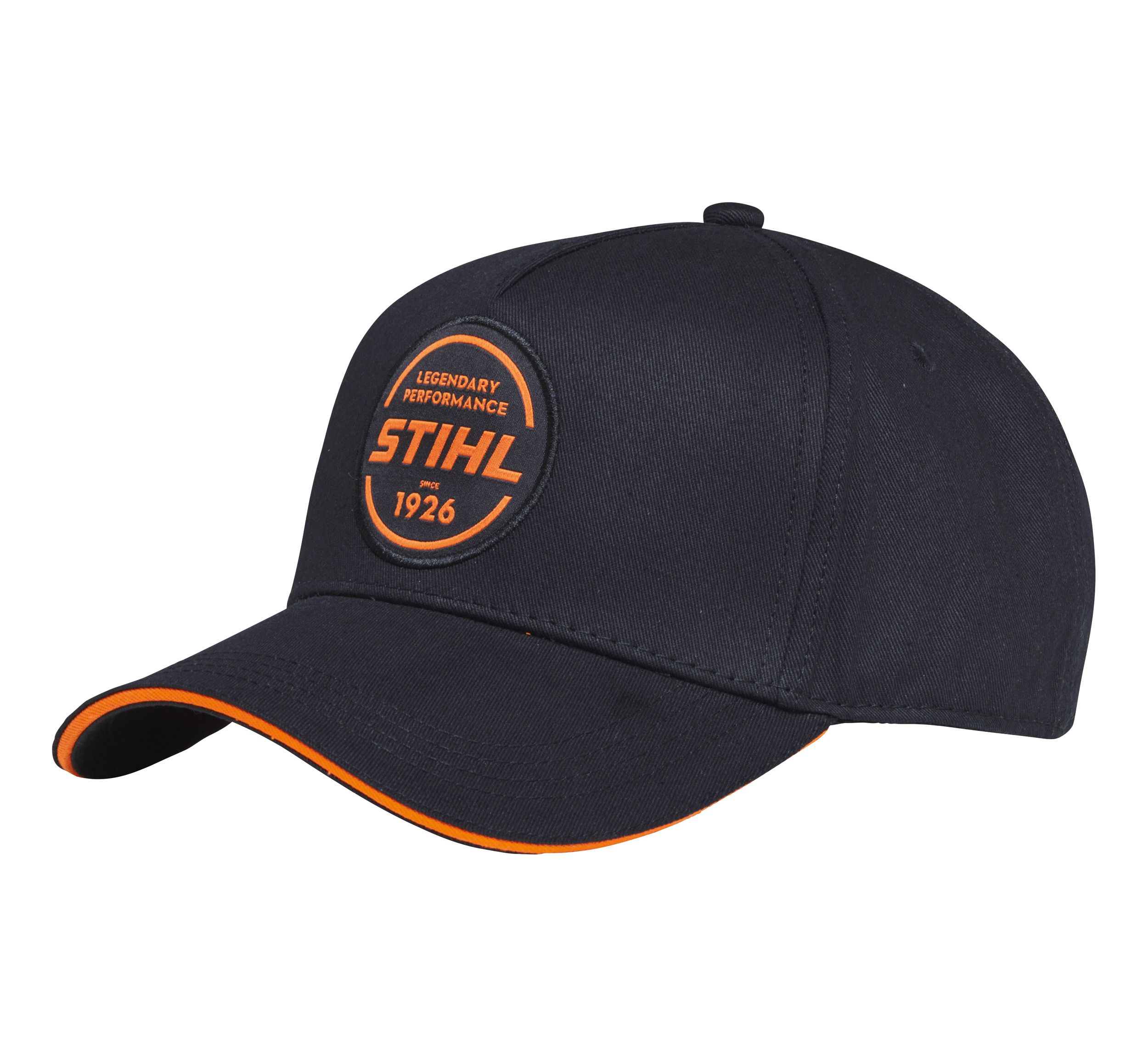 Cappellino nero da baseball, con logo arancione LEGENDARY PERFORMANCE. Si addatta a tutte le forme grazie alla clip mettallica sul retro.