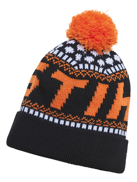 Questo berretto beanie con pompon arancione, modello norvegese nero/bianco e logo STIHL è un accessorio fantastico per l’inverno.
