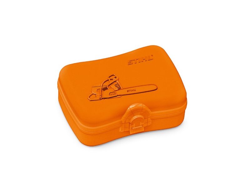 Contenitore per il pranzo sostenibile per bambini di Koziol. Perché sostenibile? Questo box per il pranzo è stato realizzato in termoplastica sintetica e cellulosa di legno naturale. Il design arrotondato evita i fastidiosi urti nella cartella scolastica. Il logo STIHL e una motosega sono impressi sul coperchio della scatola arancione.