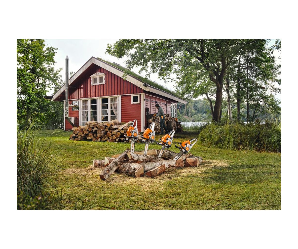 Il lavoro è reso ancora più agevole dal robusto fermo a artiglio. Con il suo aiuto, la sega si appoggia saldamente al legno. In questo modo si ottiene il taglio più preciso possibile. Se interrompete il lavoro, la motosega STIHL è subito pronta a ripartire grazie alla leva combinata con funzione di arresto. Il tendicatena laterale vi aiuta a tendere la catena in modo sicuro e semplice.