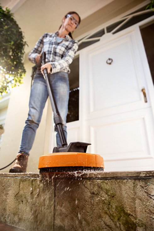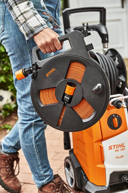 Potente idropulitrice ad alta pressione da 135 bar con un sovrappiù a comodità. Avvolgitubo con guida tubo per un rimessaggio semplice e pratico del tubo ad alta pressione, 9 m di tubo ad alta pressione rinforzato con acciaio.