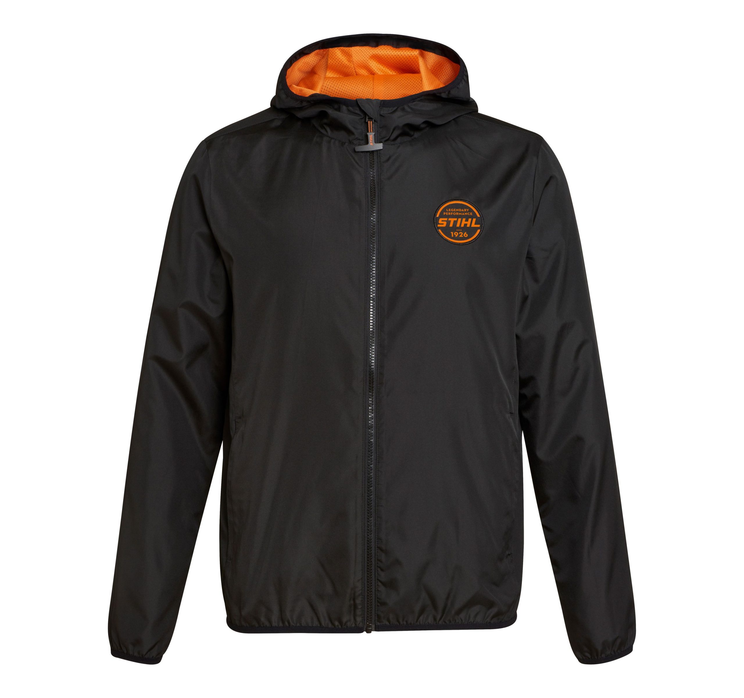 Giacca a vento sportiva in stile blouson con cappuccio ed etichetta STIHL di alta qualità in arancione sul petto. Fodera interna in rete arancione a contrasto. Polsini elastici all’orlo e alle maniche per una vestibilità comoda, tasche con zip ai lati.